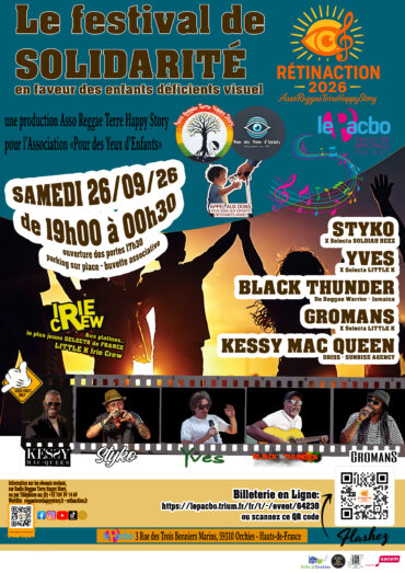 SAMEDI 26 SEPTEMBRE 2026 - 19H00 L'asso Reggae Terre Happy Story organise le Rétinaction 2026 et vous donne rendez-vous pour une soirée exceptionnelle de musique, de partage et de solidarité ! Sur scène : STYKO, YVES HDZ, GROMANS, KESSY MAC QUEEN (artiste non voyant au talent inspirant), BLACK THUNDER, venu spécialement de Jamaïque pour l’occasion,…